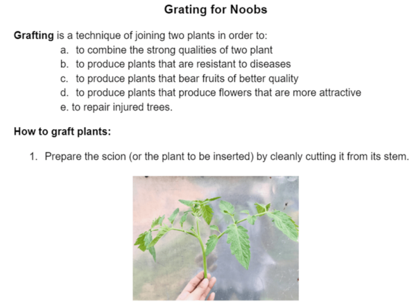 The students are going to learn the concept of grafting and its advantages by reading the article. Afterward, they have to apply what they have learned by grafting their plant by following the steps in the article.